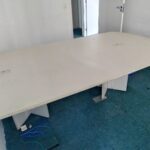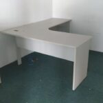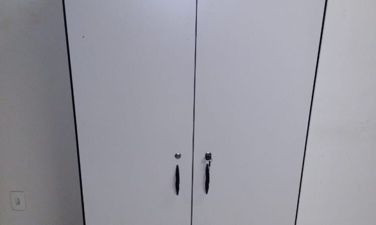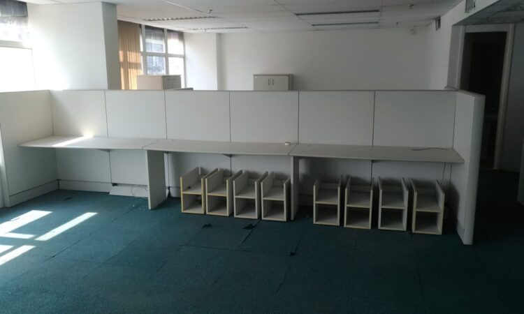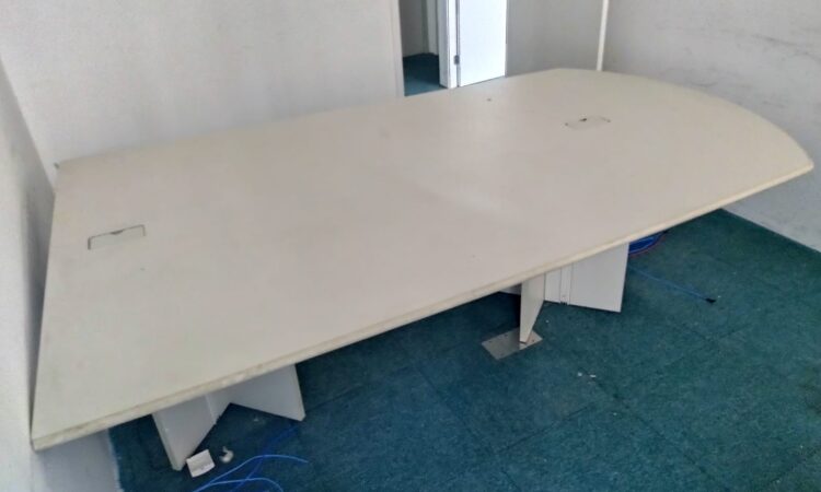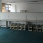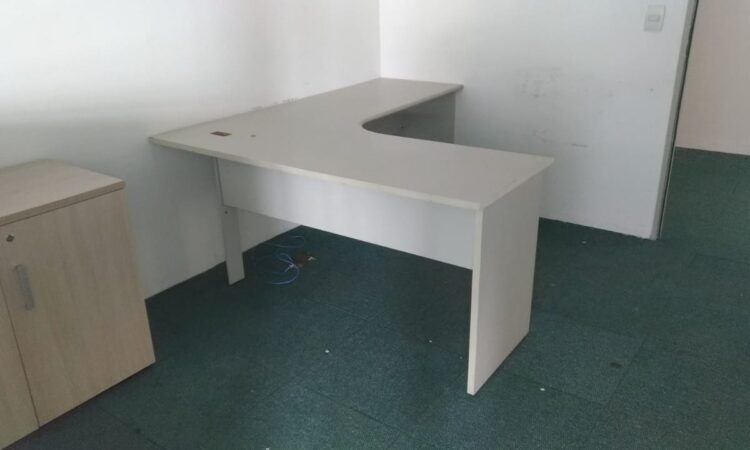 Móveis escritório diversos, em Mdf, cor bege claro ou gelo, bom estado, contendo gaveteiros com rodizios, mesas L e retas, cadeiras, armário porta alta, estantes, livreiro, armário fechado em metal, persianas, cortinas, estantes baixa em metal, estação trabalho, balcão atendimento, etc.
