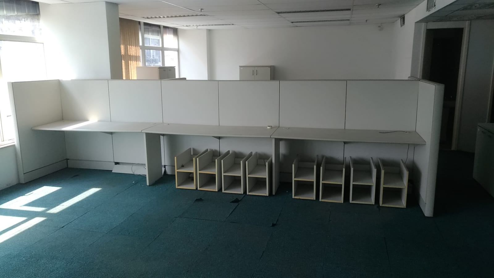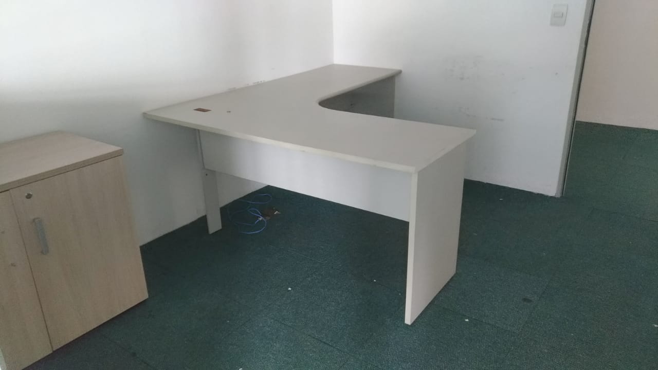Móveis escritório diversos, em Mdf, cor bege claro ou gelo, bom estado, contendo gaveteiros com rodizios, mesas L e retas, cadeiras, armário porta alta, estantes, livreiro, armário fechado em metal, persianas, cortinas, estantes baixa em metal, estação trabalho, balcão atendimento, etc.