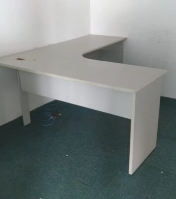 Móveis escritório diversos, em Mdf, cor bege claro ou gelo, bom estado, contendo gaveteiros com rodizios, mesas L e...